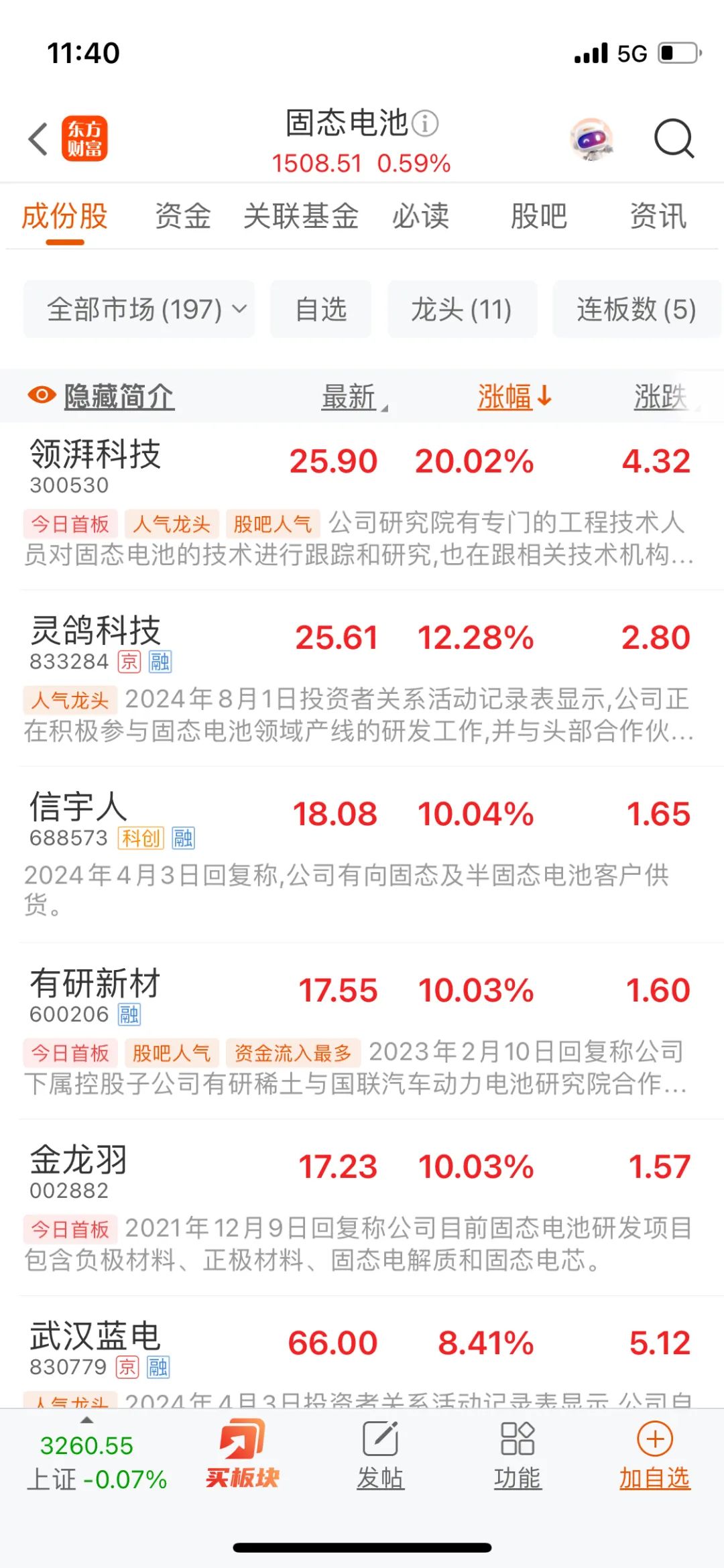 4月15日早盘,A股固态电池概念逆势走强。个股中,湖南领湃科技集团股份有限公司(简称“领湃科技”;300530)直线拉升20cm涨停,金龙羽集团股份有限公司(简称“金龙羽”;002882)、有研新材料股份有限公司(简称“有研新材”;600206)10cm涨停。板块集体飘红,武汉市蓝电电子股份有限公司(简称“武汉蓝电”;830779)、厦门厦钨新能源材料股份有限公司(简称“厦钨新能”;688778)等多只个股跟涨。