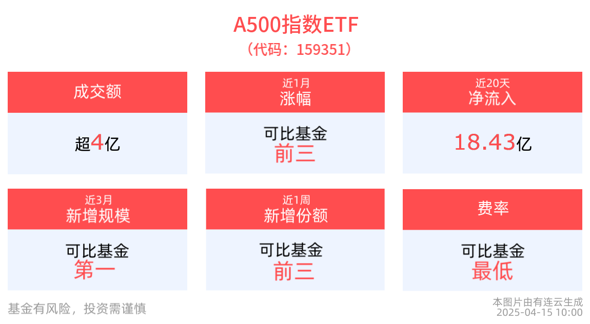 流动性方面,A500指数ETF盘中换手3.16%,成交4.79亿元。规模方面,A500指数ETF近3月规模增长23.07亿元,实现显著增长。份额方面,A500指数ETF近1周份额增长4.32亿份,实现显著增长。
