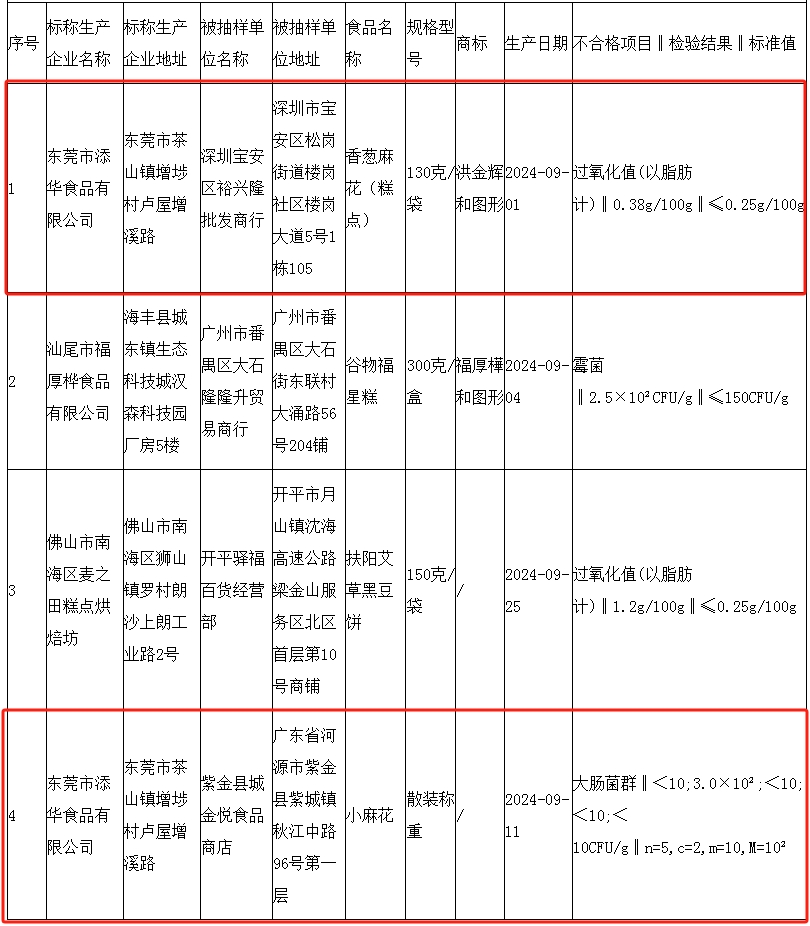 公告显示,紫金县城金悦食品商店销售的标称东莞市添华食品有限公司生产的小麻花,大肠菌群不符合食品安全国家标准规定。深圳宝安区裕兴隆批发商行销售的标称东莞市添华食品有限公司生产的香葱麻花(糕点),过氧化值(以脂肪计)不符合食品安全国家标准规定。