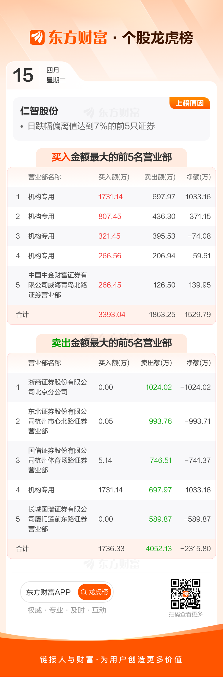 交易所2025年4月15日公布的交易公开信息显示,仁智股份因成为日跌幅偏离值达到7%的前5只证券上榜。仁智股份当日收报5.12元,涨跌幅-10.02%,偏离值-9.81%,换手率8.77%,成交额1.70亿。
