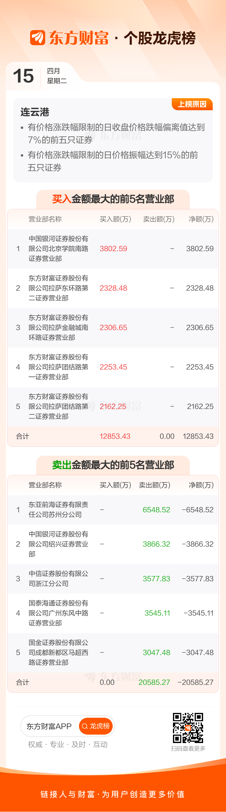 交易所2025年4月15日公布的交易公开信息显示,连云港因成为有价格涨跌幅限制的日收盘价格跌幅偏离值达到7%的前五只证券、有价格涨跌幅限制的日价格振幅达到15%的前五只证券上榜。连云港当日收报5.93元,涨跌幅-10.02%,偏离值-10.16%,换手率22.06%,成交额17.87亿。