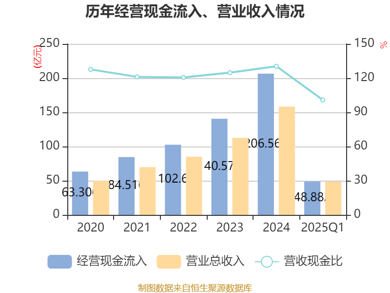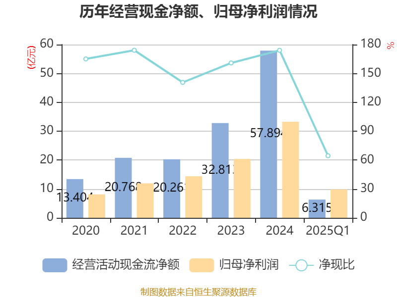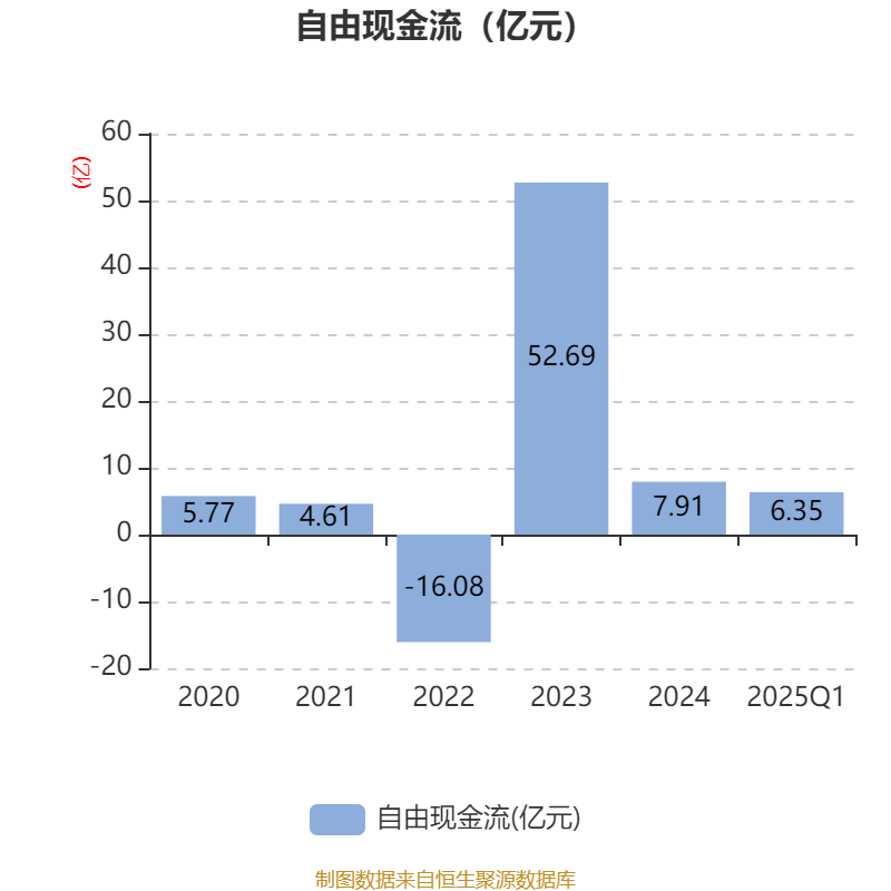 截至2025年一季度末,公司经营活动现金流净额为6.31亿元,同比下降26.53%;筹资活动现金流净额-5.11亿元,同比减少9.27亿元;投资活动现金流净额-5.24亿元,上年同期为-1.9亿元。