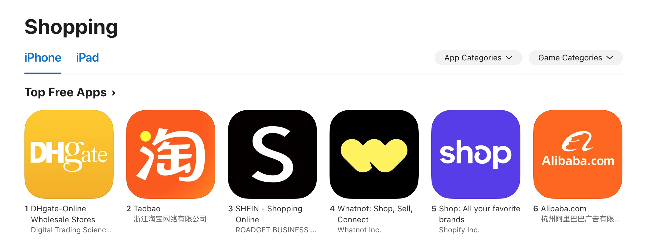 4月15日,美区App Store显示,在购物类软件中,DHgate(敦煌网)、淘宝和SHEIN成为排名前3的免费iPhone应用程序。截至发稿,在美区App Store免费iPhone应用程序总榜中,敦煌网目前排名第2,仅次于ChatGPT,淘宝则排名第8。
