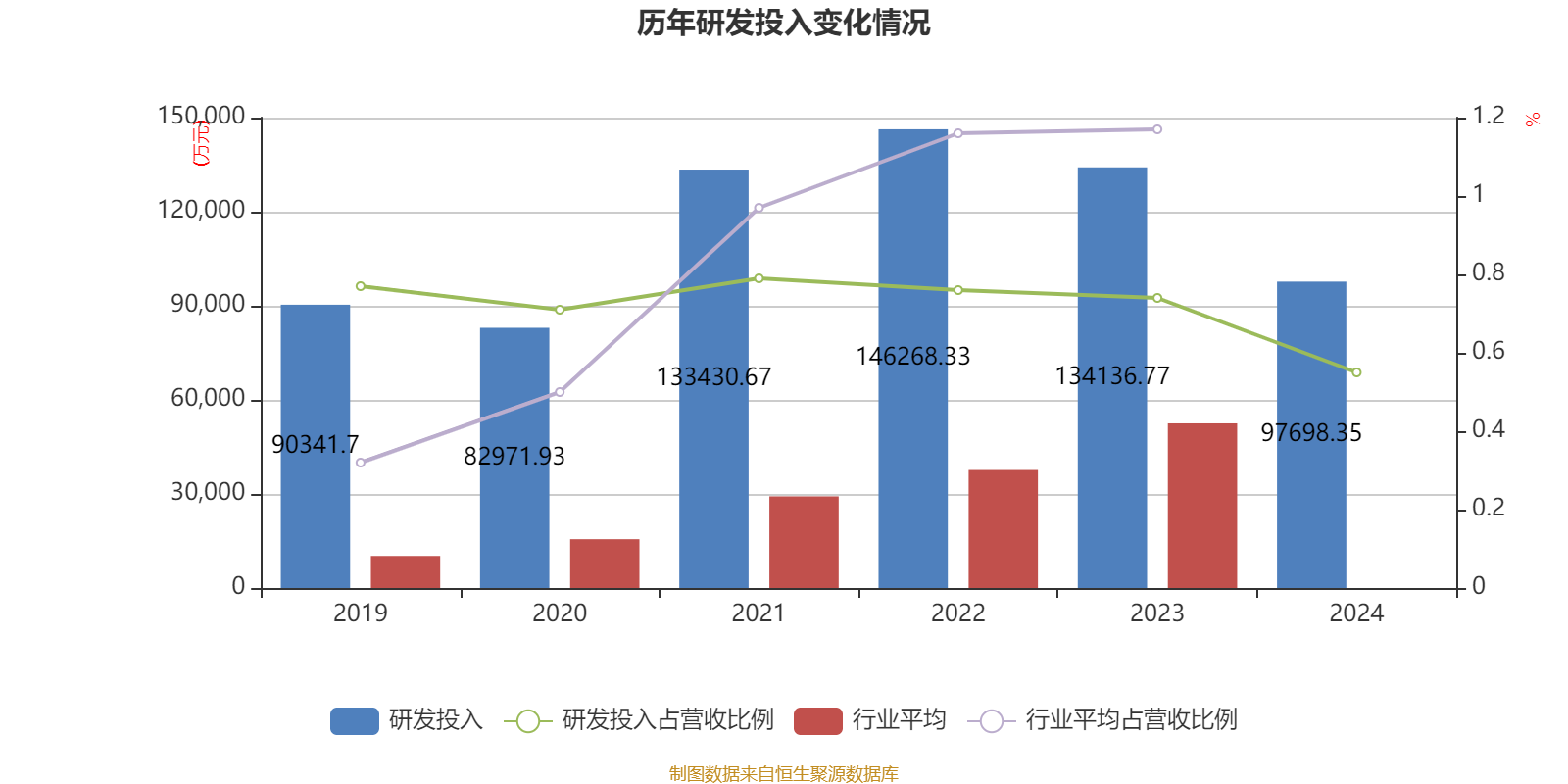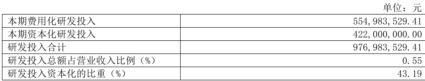 2024年全年,公司研发投入金额为9.77亿元,同比下降27.17%;研发投入占营业收入比例为0.55%,相比上年同期下降0.19个百分点。此外,公司全年研发投入资本化率为43.19%。