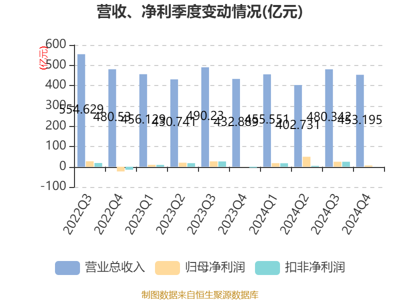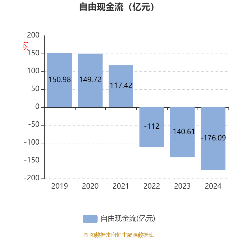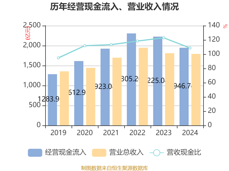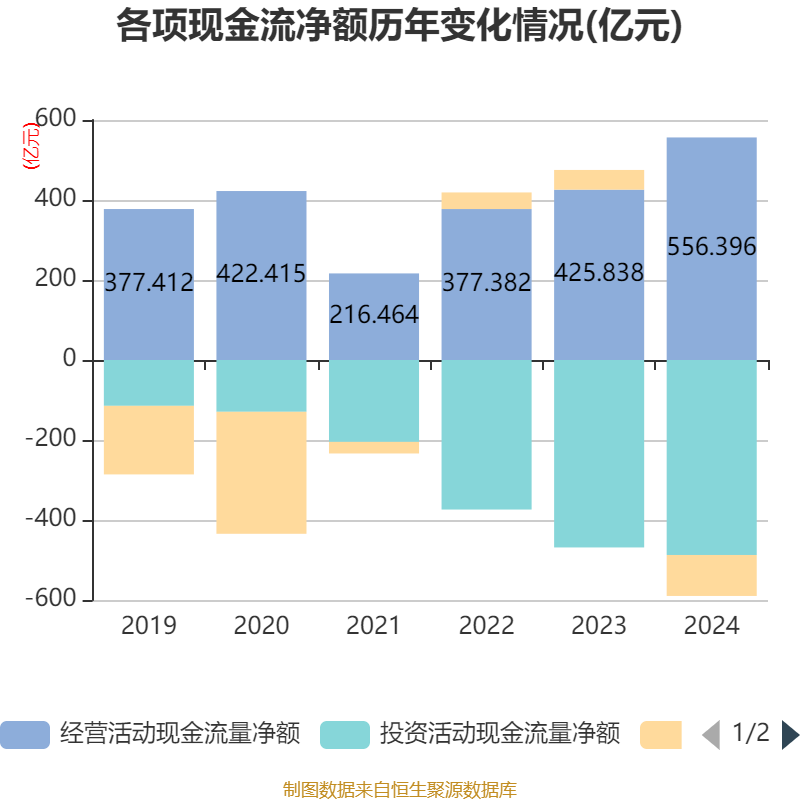 截至2024年,公司经营活动现金流净额为556.4亿元,同比增长30.66%;筹资活动现金流净额-102.42亿元,同比减少151.7亿元;投资活动现金流净额-487.45亿元,上年同期为-468.6亿元。