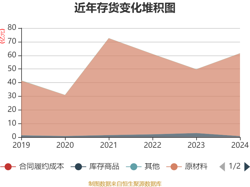从存货变动来看,截至2024年末,公司存货账面价值为61.48亿元,占净资产的10.97%,较上年末增加11.73亿元。其中,存货跌价准备为1.17亿元,计提比例为1.87%。