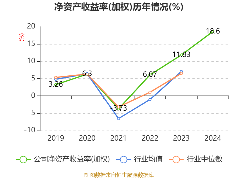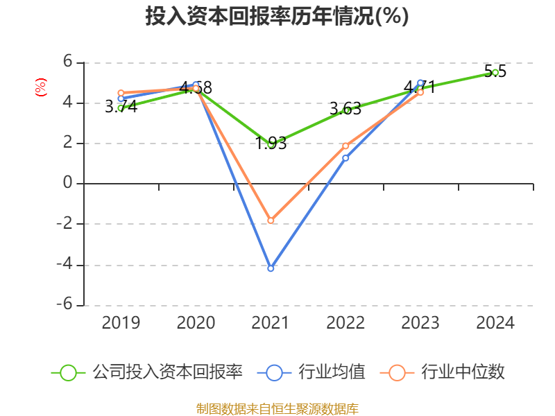数据显示,2024年公司加权平均净资产收益率为18.6%,较上年同期上升6.77个百分点。公司2024年投入资本回报率为5.5%,较上年同期上升0.79个百分点。