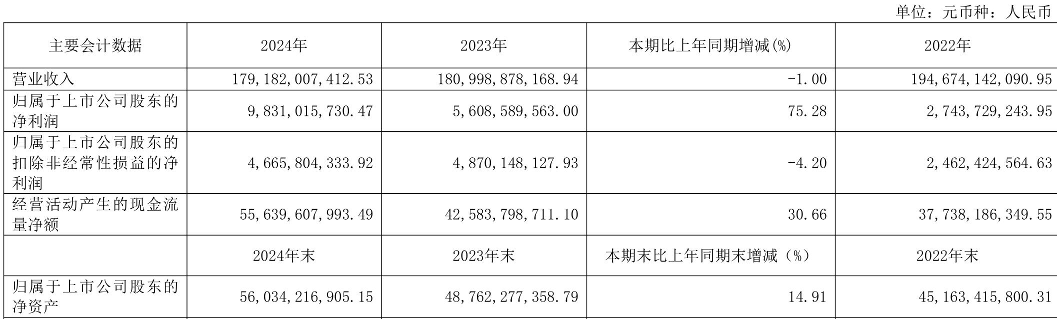 中证智能财讯国电电力(600795)4月16日披露2024年年度报告。2024年,公司实现营业总收入1791.82亿元,同比下降1.00%;归母净利润98.31亿元,同比增长75.28%;扣非净利润46.66亿元,同比下降4.20%;经营活动产生的现金流量净额为556.4亿元,同比增长30.66%;报告期内,国电电力基本每股收益为0.551元,加权平均净资产收益率为18.60%。公司2024年度分配预案为:拟向全体股东每10股派现1.1元(含税)。