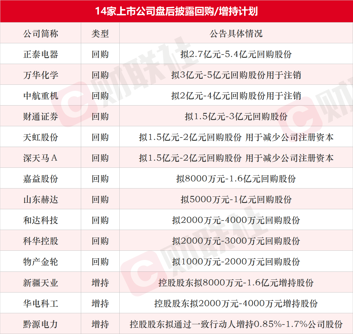 截至发稿,据不完全统计,盘后包括正泰电器、万华化学、中航重机、财通证券、天虹股份、深天马A、嘉益股份、山东赫达、和达科技、科华控股、物产金轮、新疆天业、华电科工和黔源电力在内的14家A股上市公司盘后披露回购或增持计划公告。