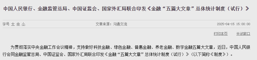 自中央金融工作会议提出要做好金融“五篇大文章”之后,央行在以往工作的基础上,开始建立更加系统、完善的统计体系。央行行长潘功胜在2024金融街论坛年会上曾强调,持续做好金融“五篇大文章”,切实加强对重大战略、重点领域和薄弱环节的优质金融服务。2024年起,央行会同金融监管总局、中国证监会、国家外汇局建立跨部门工作机制,启动建立总体统计制度、统一统计标准的工作。