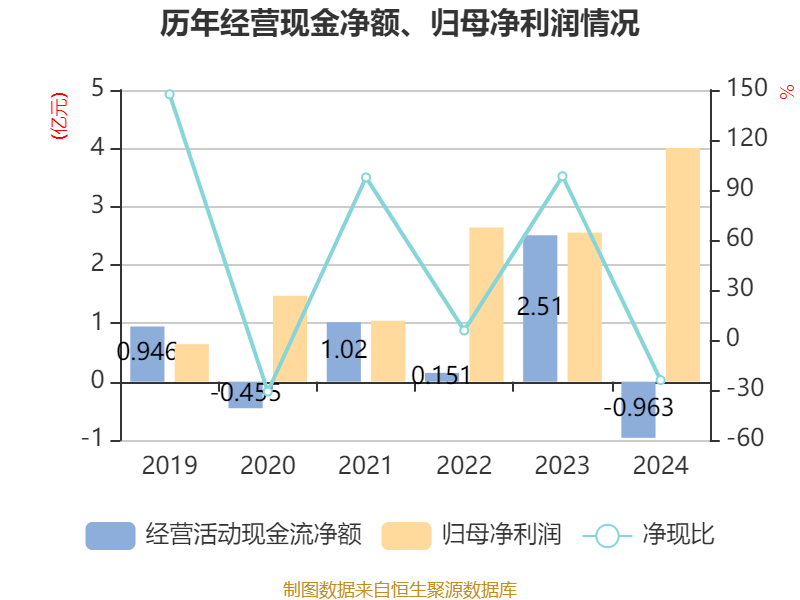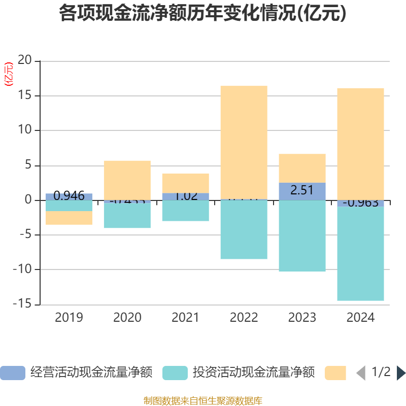 截至2024年,公司经营活动现金流净额为-9632.98万元,同比减少3.47亿元;筹资活动现金流净额16.07亿元,同比增加11.94亿元;投资活动现金流净额-13.5亿元,上年同期为-10.26亿元。