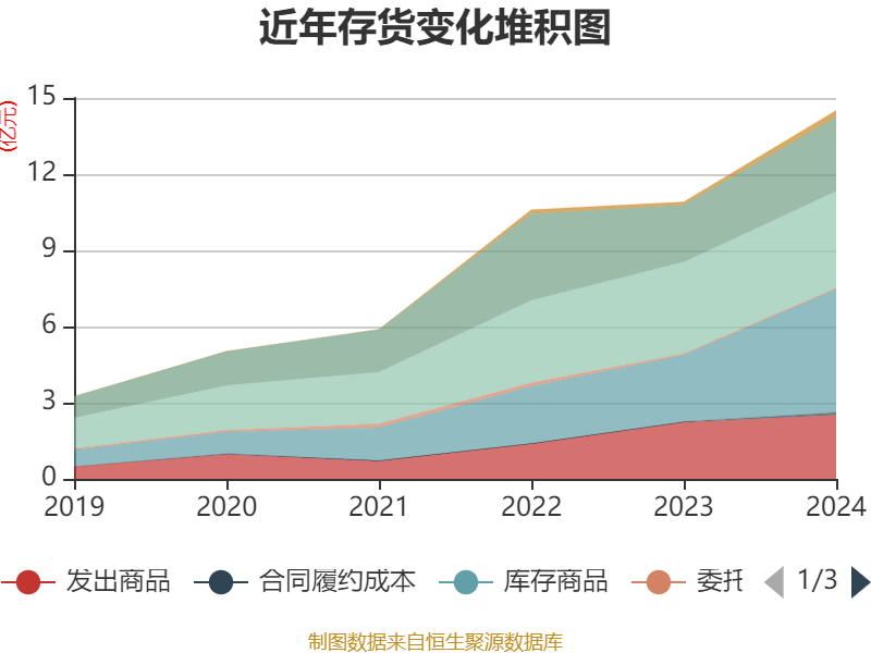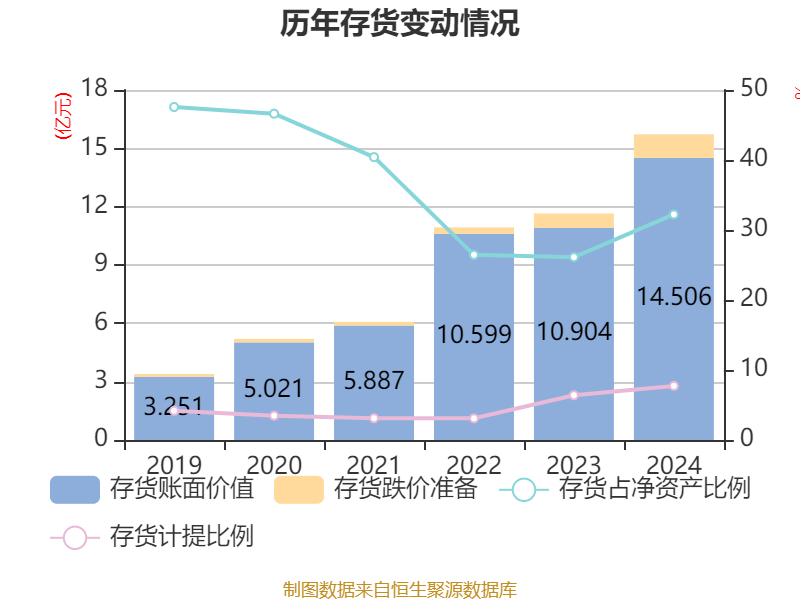 从存货变动来看,截至2024年末,公司存货账面价值为14.51亿元,占净资产的32.22%,较上年末增加3.6亿元。其中,存货跌价准备为1.22亿元,计提比例为7.73%。