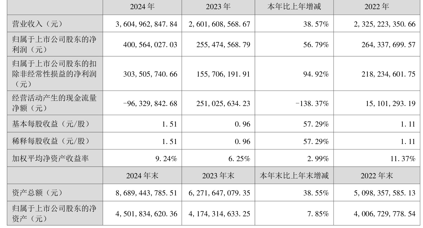 中证智能财讯江丰电子(300666)4月16日披露2024年年度报告。2024年,公司实现营业总收入36.05亿元,同比增长38.57%;归母净利润4.01亿元,同比增长56.79%;扣非净利润3.04亿元,同比增长94.92%;经营活动产生的现金流量净额为-9632.98万元,上年同期为2.51亿元;报告期内,江丰电子基本每股收益为1.51元,加权平均净资产收益率为9.24%。公司2024年度分配预案为:拟向全体股东每10股派现3.06元(含税)。