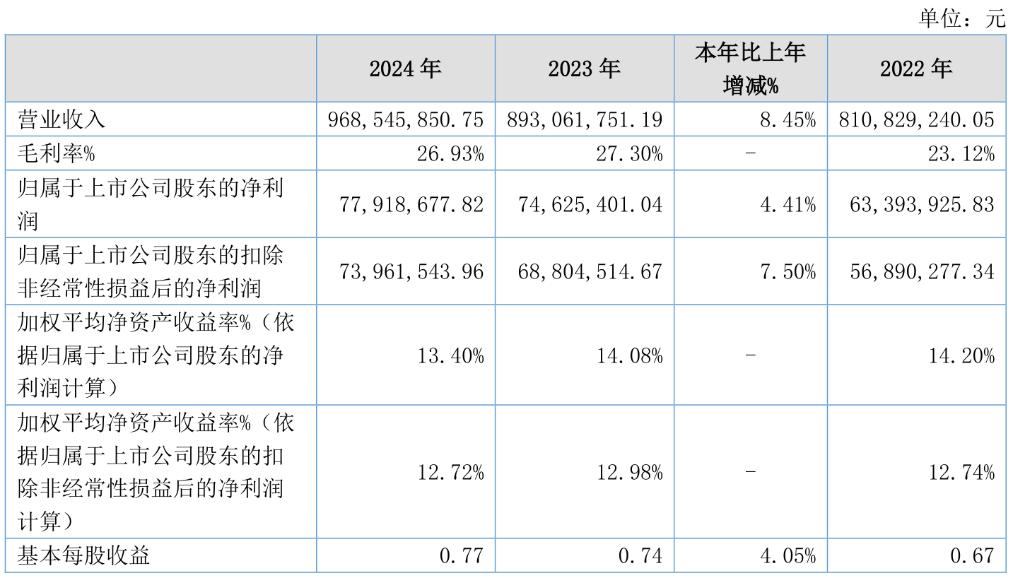 2024年全年,公司研发投入金额为3825.13万元,同比增长6.78%;研发投入占营业收入比例为3.95%,相比上年同期下降0.06个百分点。此外,公司全年研发投入资本化率为0%。