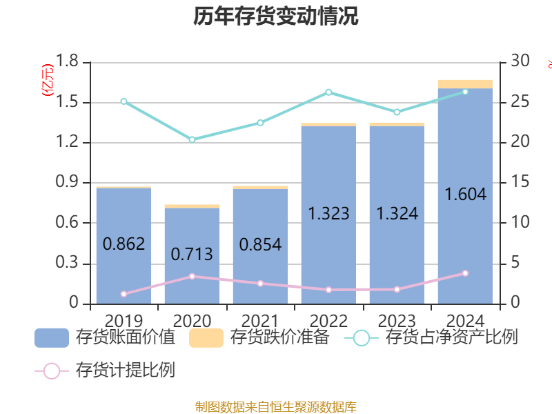从存货变动来看,截至2024年末,公司存货账面价值为1.6亿元,占净资产的26.32%,较上年末增加2809.42万元。其中,存货跌价准备为629.15万元,计提比例为3.77%。