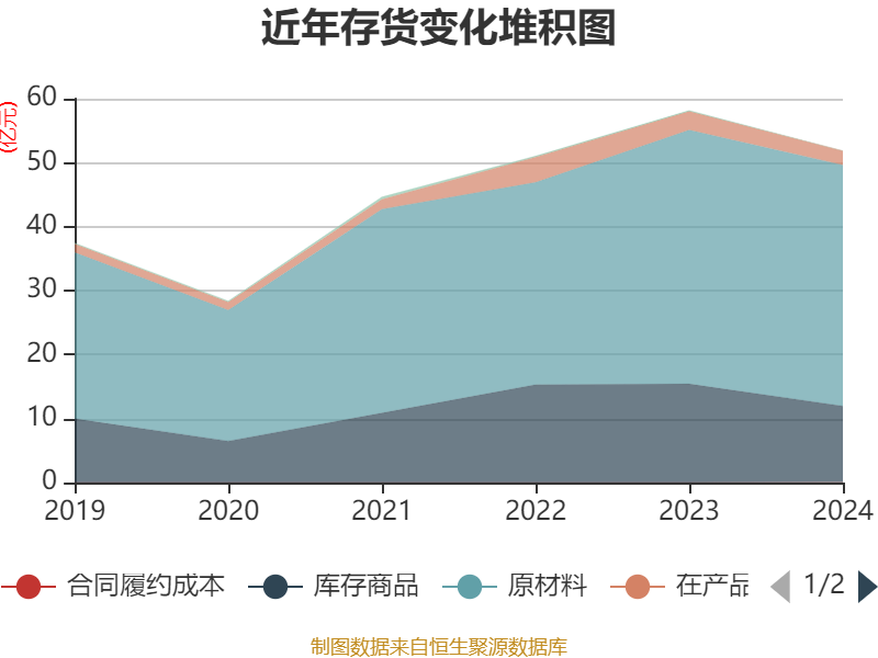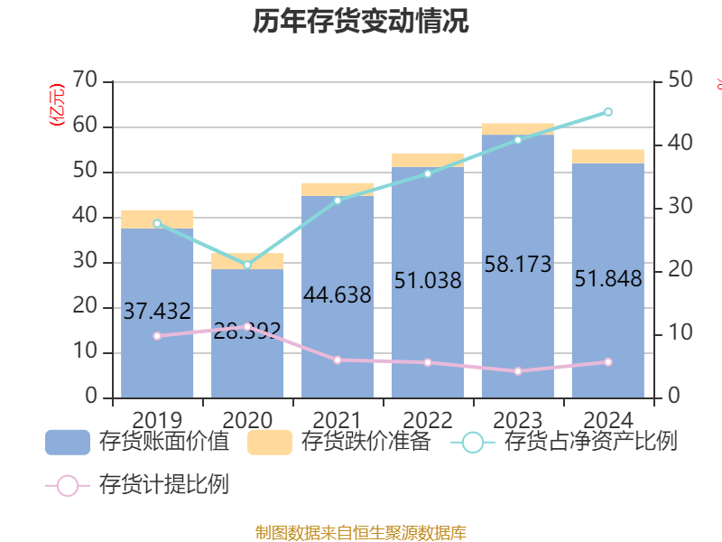 从存货变动来看,截至2024年末,公司存货账面价值为51.85亿元,占净资产的45.16%,较上年末减少6.33亿元。其中,存货跌价准备为3.07亿元,计提比例为5.6%。