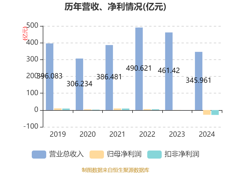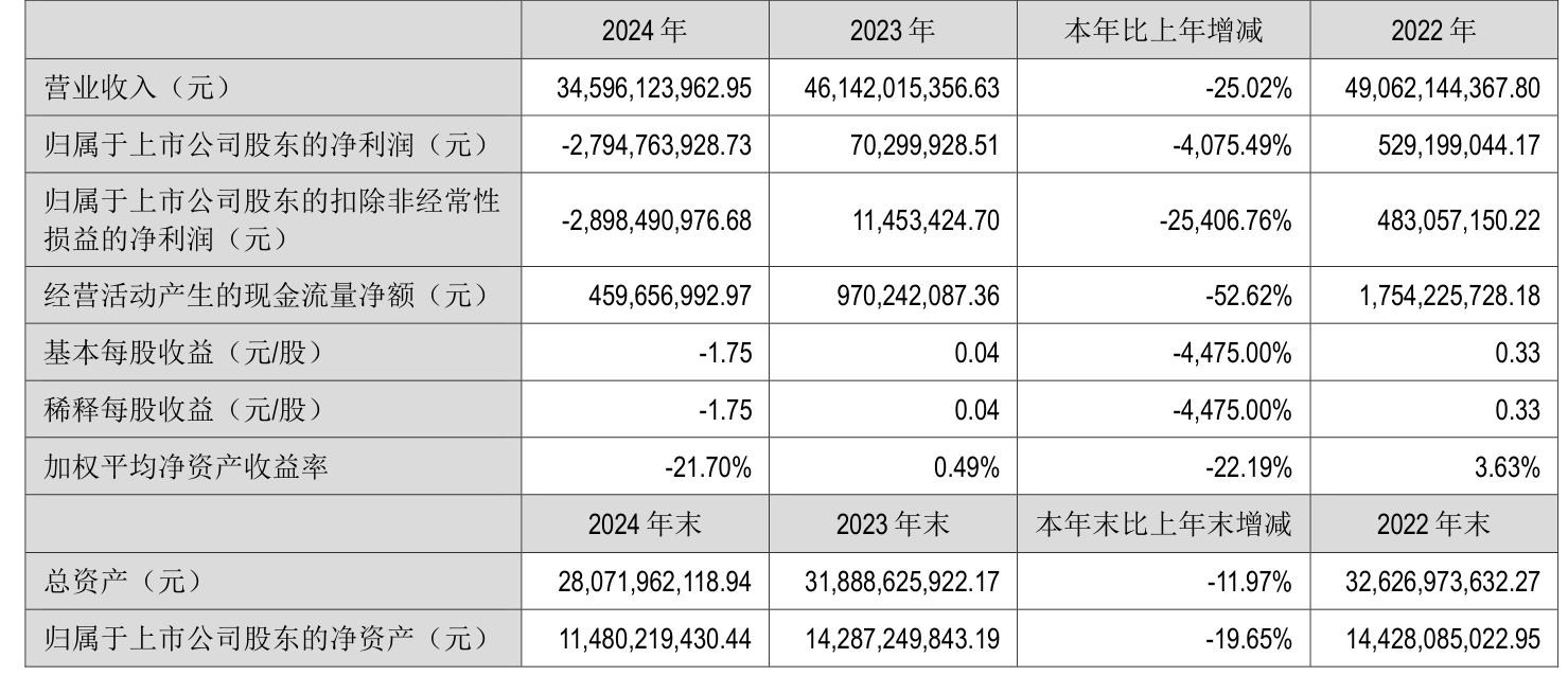中证智能财讯华锦股份(000059)4月16日披露2024年年度报告。2024年,公司实现营业总收入345.96亿元,同比下降25.02%;归母净利润亏损27.95亿元,上年同期盈利7029.99万元;扣非净利润亏损28.98亿元,上年同期盈利1145.34万元;经营活动产生的现金流量净额为4.6亿元,同比下降52.62%;报告期内,华锦股份基本每股收益为-1.75元,加权平均净资产收益率为-21.70%。公司2024年度分配预案为:拟向全体股东每10股派现0.18元(含税)。
