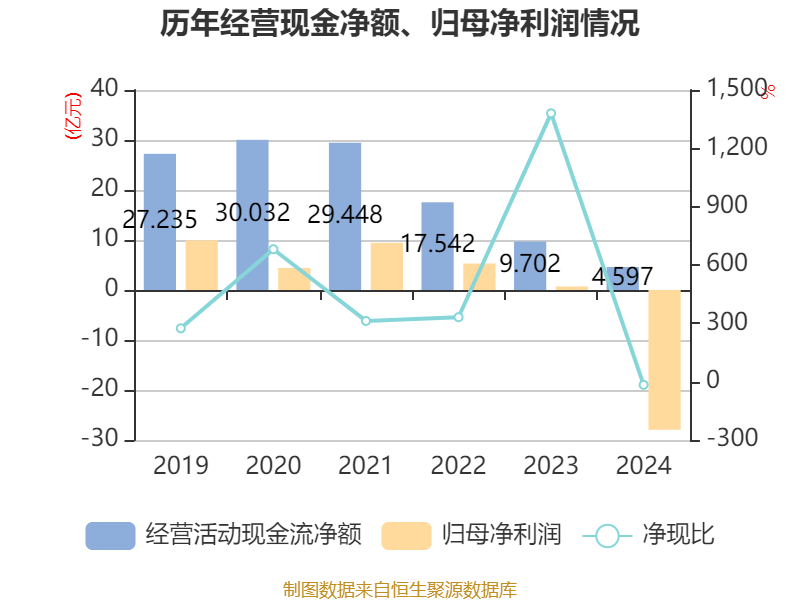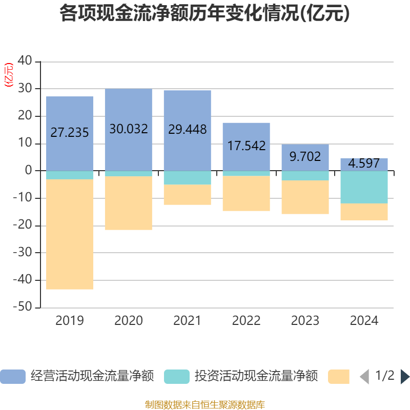 截至2024年,公司经营活动现金流净额为4.6亿元,同比下降52.62%;筹资活动现金流净额-6.19亿元,同比增加6.1亿元;投资活动现金流净额-11.93亿元,上年同期为-3.51亿元。