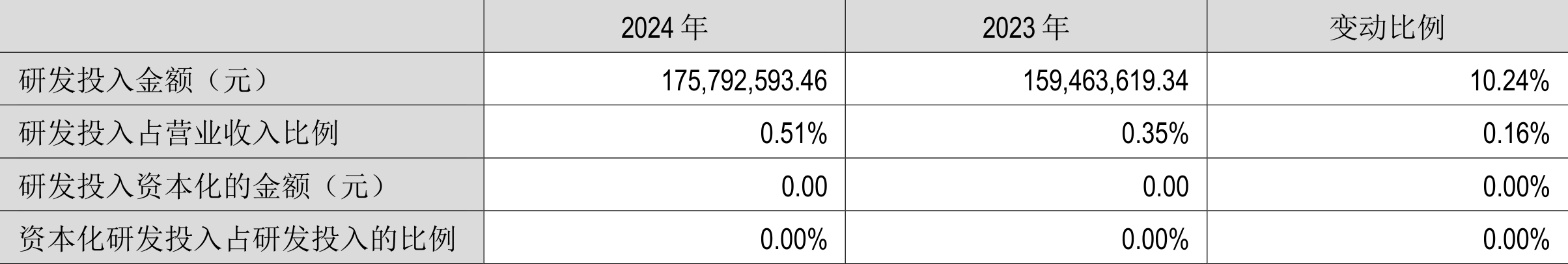 2024年全年,公司研发投入金额为1.76亿元,同比增长10.24%;研发投入占营业收入比例为0.51%,相比上年同期上升0.16个百分点。此外,公司全年研发投入资本化率为0%。