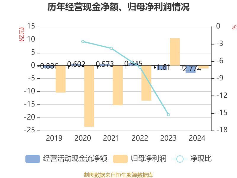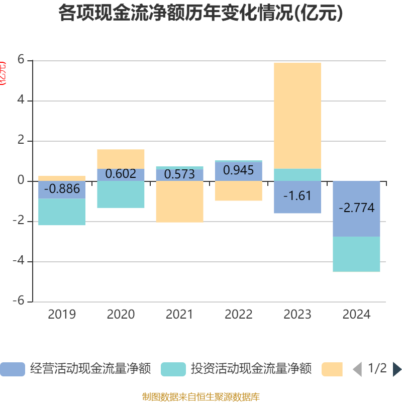 截至2024年,公司经营活动现金流净额为-2.77亿元,同比减少1.16亿元;筹资活动现金流净额-94.46万元,同比减少5.27亿元;投资活动现金流净额-1.75亿元,上年同期为6118.06万元。