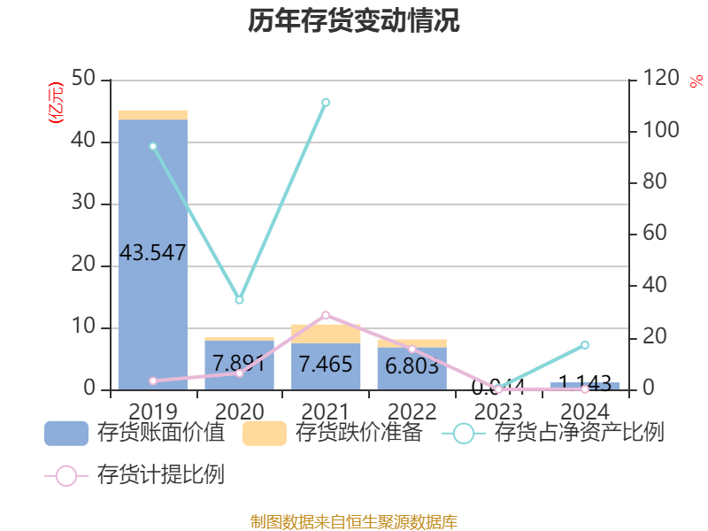 从存货变动来看,截至2024年末,公司存货账面价值为1.14亿元,占净资产的17.19%,较上年末增加1.1亿元。其中,存货跌价准备为5.76万元,计提比例为0.05%。