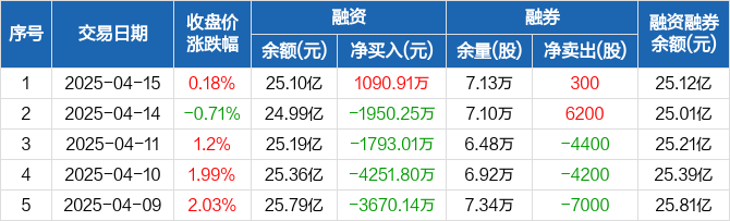 融资方面,当日融资买入7229.55万元,融资偿还6138.64万元,融资净买入1090.91万元。融券方面,融券卖出600股,融券偿还300股,融券余量7.13万股,融券余额239.21万元。融资融券余额合计25.12亿元。