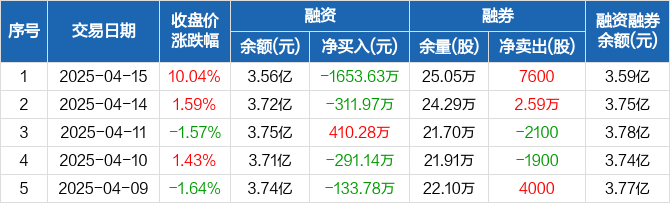 融资方面,当日融资买入7009.77万元,融资偿还8663.4万元,融资净偿还1653.63万元。融券方面,融券卖出7600股,融券偿还0股,融券余量25.05万股,融券余额351.45万元。融资融券余额合计3.59亿元。