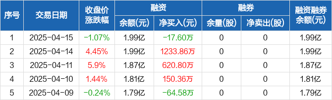 融资方面,当日融资买入2932.47万元,融资偿还2950.06万元,融资净偿还17.6万元。融券方面,融券卖出0股,融券偿还0股,融券余量0股,融券余额0元。融资融券余额合计1.99亿元。