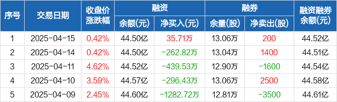 融资方面,当日融资买入2271.88万元,融资偿还2236.17万元,融资净买入35.71万元。融券方面,融券卖出300股,融券偿还100股,融券余量13.06万股,融券余额155.15万元。融资融券余额合计44.52亿元。