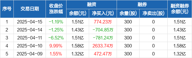 融资方面,当日融资买入2620.09万元,融资偿还1845.86万元,融资净买入774.23万元。融券方面,融券卖出0股,融券偿还0股,融券余量300股,融券余额3735元。融资融券余额合计1.51亿元。