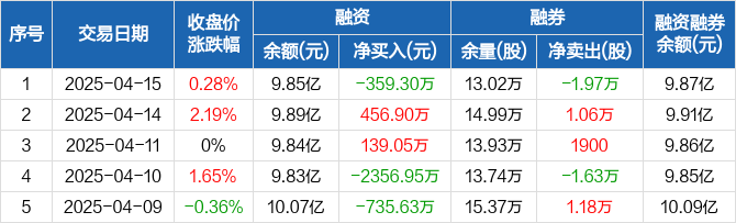 融资方面,当日融资买入2857.29万元,融资偿还3216.59万元,融资净偿还359.3万元。融券方面,融券卖出800股,融券偿还2.05万股,融券余量13.02万股,融券余额188.79万元。融资融券余额合计9.87亿元。