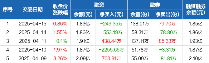 融资方面,当日融资买入2863.29万元,融资偿还3106.63万元,融资净偿还243.35万元。融券方面,融券卖出119.61万份,融券偿还39.91万份,融券余量138.01万份,融券余额146.15万元。融资融券余额合计1.85亿元。