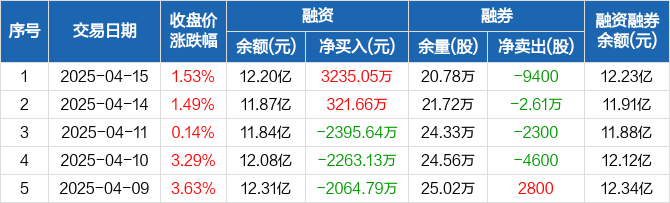 融资方面,当日融资买入9087.51万元,融资偿还5852.46万元,融资净买入3235.05万元。融券方面,融券卖出8500股,融券偿还1.79万股,融券余量20.78万股,融券余额316.27万元。融资融券余额合计12.23亿元。