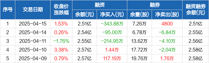 融资方面,当日融资买入1128万元,融资偿还1471.88万元,融资净偿还343.88万元,连续3日净偿还累计653.82万元。融券方面,融券卖出1.13万股,融券偿还6500股,融券余量7.26万股,融券余额28.89万元。融资融券余额合计2.51亿元。