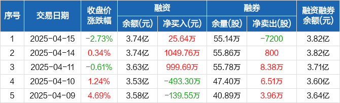 融资方面,当日融资买入3093.68万元,融资偿还3068.03万元,融资净买入25.64万元,连续3日净买入累计2075.1万元。融券方面,融券卖出1.54万股,融券偿还2.26万股,融券余量55.14万股,融券余额785.75万元。融资融券余额合计3.82亿元。