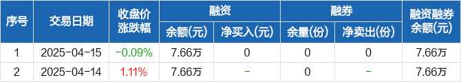 融资方面,当日融资买入0元,融资偿还0元,融资净买入0元。融券方面,融券卖出0份,融券偿还0份,融券余量0份,融券余额0元。融资融券余额合计7.66万元。