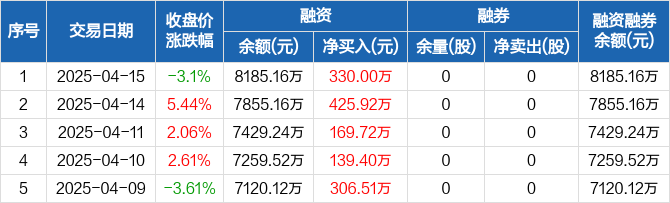 九鼎新材融资融券信息显示,2025年4月15日融资净买入330万元;融资余额8185.16万元,较前一日增加4.2%。