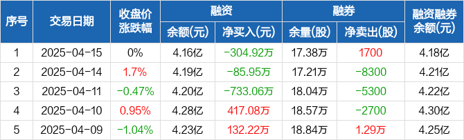 融资方面,当日融资买入716万元,融资偿还1020.92万元,融资净偿还304.92万元,连续3日净偿还累计1123.93万元。融券方面,融券卖出2200股,融券偿还500股,融券余量17.38万股,融券余额186.66万元。融资融券余额合计4.18亿元。