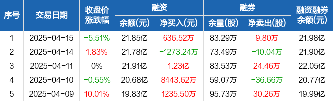 融资方面,当日融资买入3.29亿元,融资偿还3.22亿元,融资净买入636.52万元。融券方面,融券卖出10.04万股,融券偿还2400股,融券余量83.29万股,融券余额1314.32万元。融资融券余额合计21.98亿元。