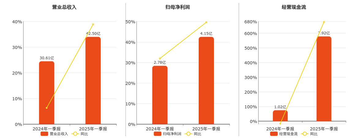公司营业总收入为42.50亿元。归母净利润为4.15亿元。经营活动现金净流入为7.92亿元。