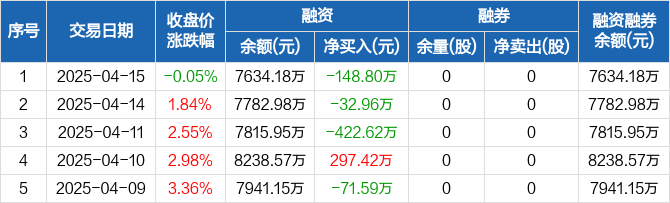 融资方面,当日融资买入226.32万元,融资偿还375.12万元,融资净偿还148.8万元,连续3日净偿还累计604.39万元。融券方面,融券卖出0股,融券偿还0股,融券余量0股,融券余额0元。融资融券余额合计7634.18万元。