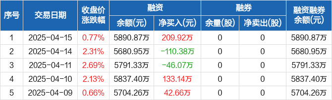 融资方面,当日融资买入407.32万元,融资偿还197.4万元,融资净买入209.92万元。融券方面,融券卖出0股,融券偿还0股,融券余量0股,融券余额0元。融资融券余额合计5890.87万元。