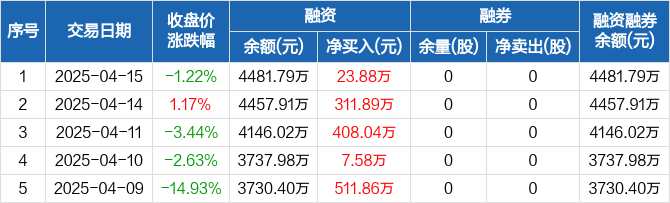 融资方面,当日融资买入1305.72万元,融资偿还1281.84万元,融资净买入23.88万元,连续5日净买入累计1263.25万元。融券方面,融券卖出0股,融券偿还0股,融券余量0股,融券余额0元。融资融券余额合计4481.79万元。