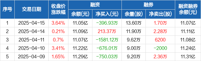 融资方面,当日融资买入3574.03万元,融资偿还3970.97万元,融资净偿还396.93万元。融券方面,融券卖出2.78万股,融券偿还1.08万股,融券余量13.6万股,融券余额263.43万元。融资融券余额合计11.07亿元。