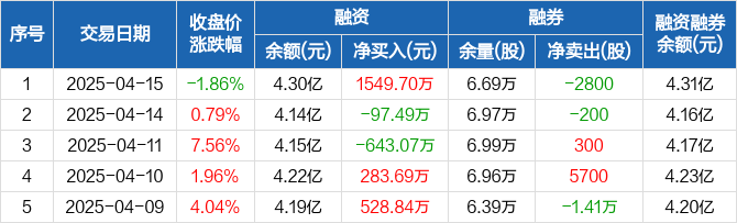 融资方面,当日融资买入2547.32万元,融资偿还997.62万元,融资净买入1549.7万元。融券方面,融券卖出0股,融券偿还2800股,融券余量6.69万股,融券余额151.51万元。融资融券余额合计4.31亿元。