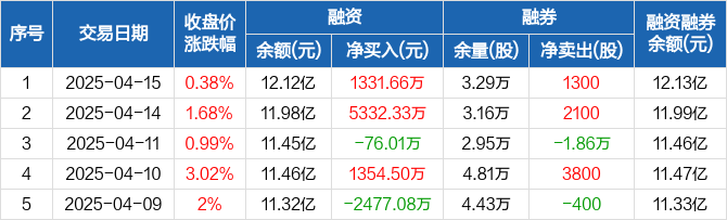 融资方面,当日融资买入1.1亿元,融资偿还9695.26万元,融资净买入1331.66万元。融券方面,融券卖出4500股,融券偿还3200股,融券余量3.29万股,融券余额96.04万元。融资融券余额合计12.13亿元。