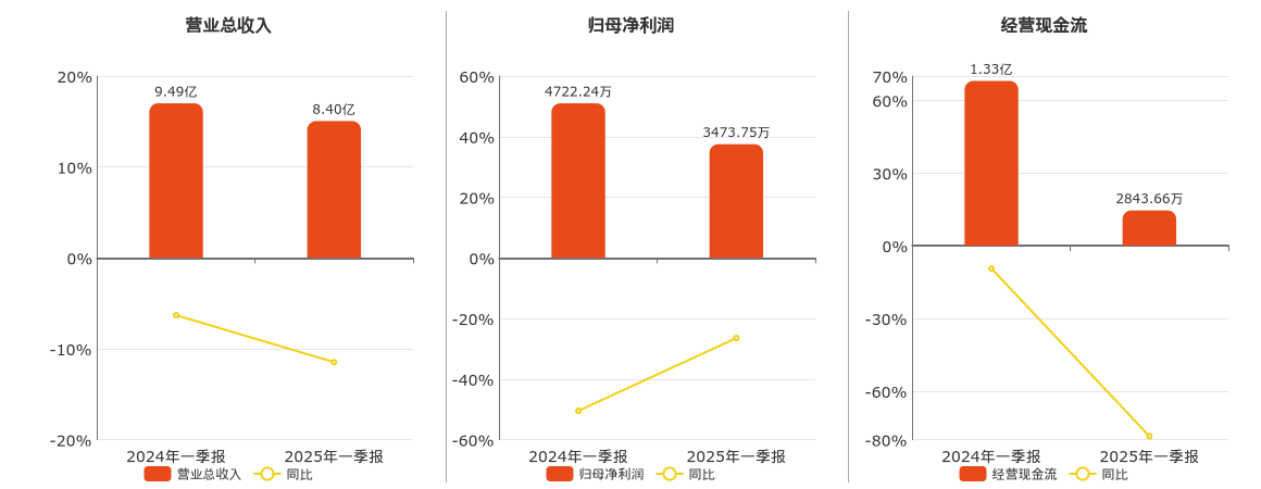 公司营业总收入为8.40亿元,较去年同报告期营业总收入减少1.09亿元,同比较去年同期下降11.47%。归母净利润为3473.75万元,较去年同报告期归母净利润减少1248.49万元,同比较去年同期下降26.44%。经营活动现金净流入为2843.66万元,较去年同报告期经营活动现金净流入减少1.04亿元,同比较去年同期下降78.57%。