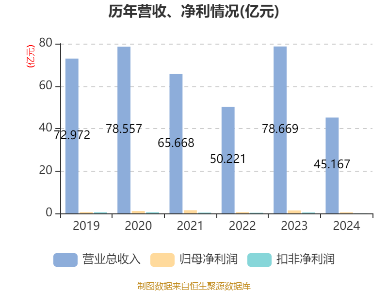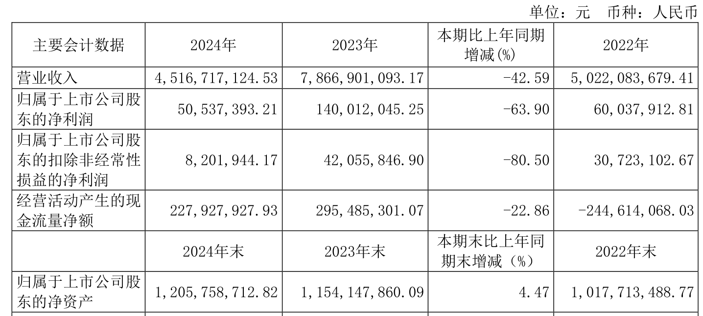 中证智能财讯上海物贸(600822)4月16日披露2024年年度报告。2024年,公司实现营业总收入45.17亿元,同比下降42.59%;归母净利润5053.74万元,同比下降63.90%;扣非净利润820.19万元,同比下降80.50%;经营活动产生的现金流量净额为2.28亿元,同比下降22.86%;报告期内,上海物贸基本每股收益为0.1元,加权平均净资产收益率为4.28%。