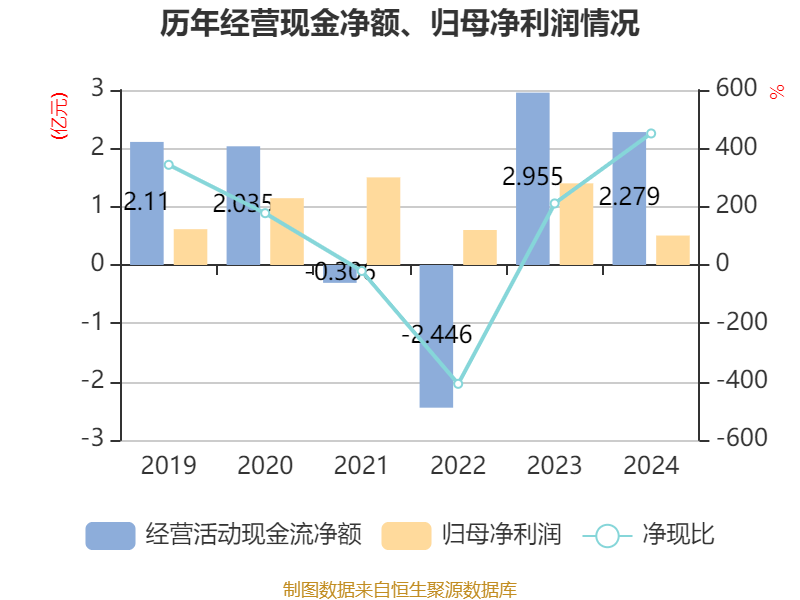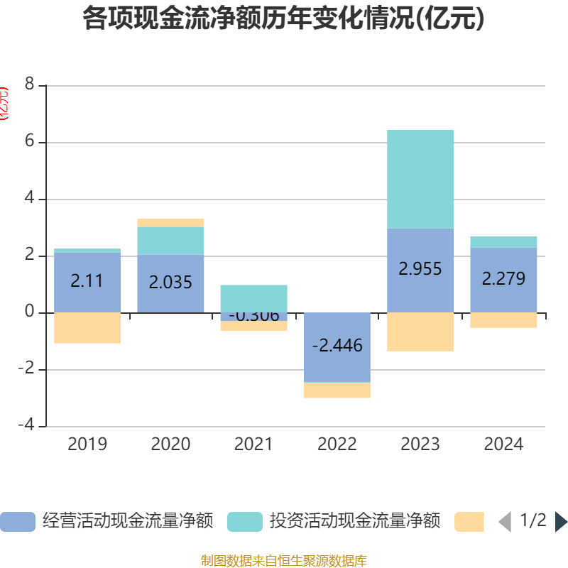 截至2024年,公司经营活动现金流净额为2.28亿元,同比下降22.86%;筹资活动现金流净额-5435.76万元,同比增加8286.19万元;投资活动现金流净额3955.17万元,上年同期为3.47亿元。