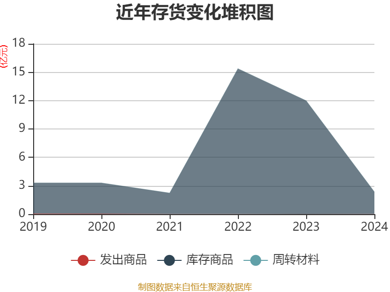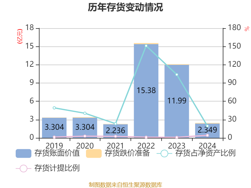 从存货变动来看,截至2024年末,公司存货账面价值为2.35亿元,占净资产的19.48%,较上年末减少9.64亿元。其中,存货跌价准备为1039.27万元,计提比例为4.24%。